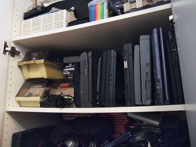 普段あまり使ってないPCは押し入れに積み込んでいます。今日は約30台ほどを一気に点検していきます。棚はこんな感じで、後ろにもぎっしり詰まっています。