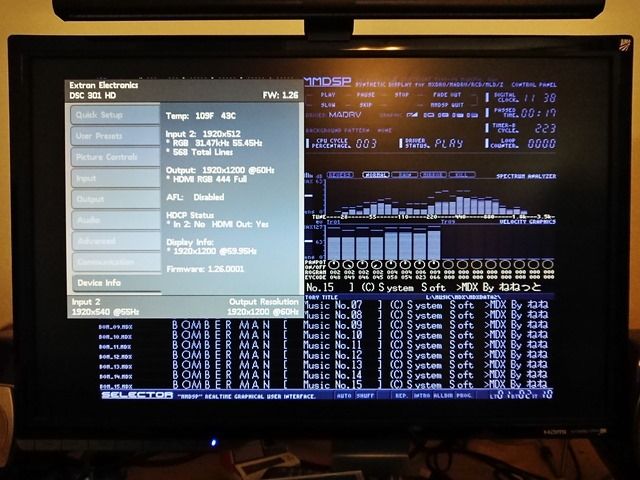 PS2の複合同期は、ファームウェアを最後のバージョンに変えてみましたが、残念ながらうまくは映りませんでした。画面の周波数が変わるとき、少しブラックアウトもあるので、ゲーム機向きとは言えないのかも(元々ゲームなんかは対象外と思いますが・・・)です。とは言え、レトロPCにはかなり良い装置だと思います。一応コンポーネント接続でも試してみたいので、ケーブルは発注してみました。Amazonで一番安いなので、到着まで時間かかりそうです。
