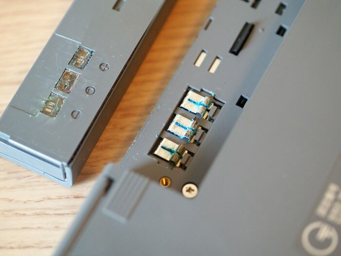ニッカドバッテリーは、さすがに液漏れです。仕様では3.6時間駆動って書かれているので、半分の1時間半くらいって感じだったんでしょうか。バッテリーを外すと、奥に110ピンの拡張端子があります。ケーブルで引き出すFM音源とかならつきそうです。(持ってたけど大昔に捨ててしまいました・・・)