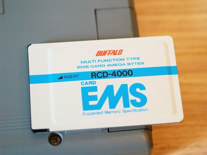 メモリーカードスロットにはよく見かけるバッファローの4MBのメモリーカードが刺さっていました。反対側にもスロットがありますが、まだフラッシュストレージが出る前で、S-RAMカードのみ対応です。当時からS-RAMカードは高いだけで無く電池もすぐ切れるしかなり苦労しそうです。