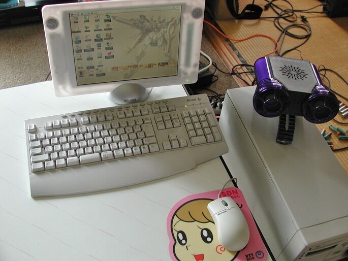 液晶モニターも増えています。12インチで15Khzも映るテレビモニターですね。ネット環境もISDN変わっていたので、ISDNはじめちゃんのマウスパッドに。