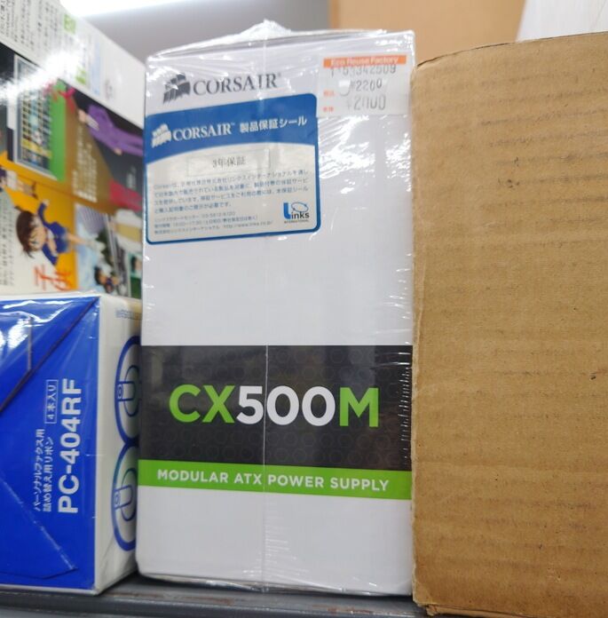 コルセアの500w電源。モジュラー式で未開封みたいですが、10年くらい前の物なのでやめておきました。600wくらいは欲しいかなぁ
